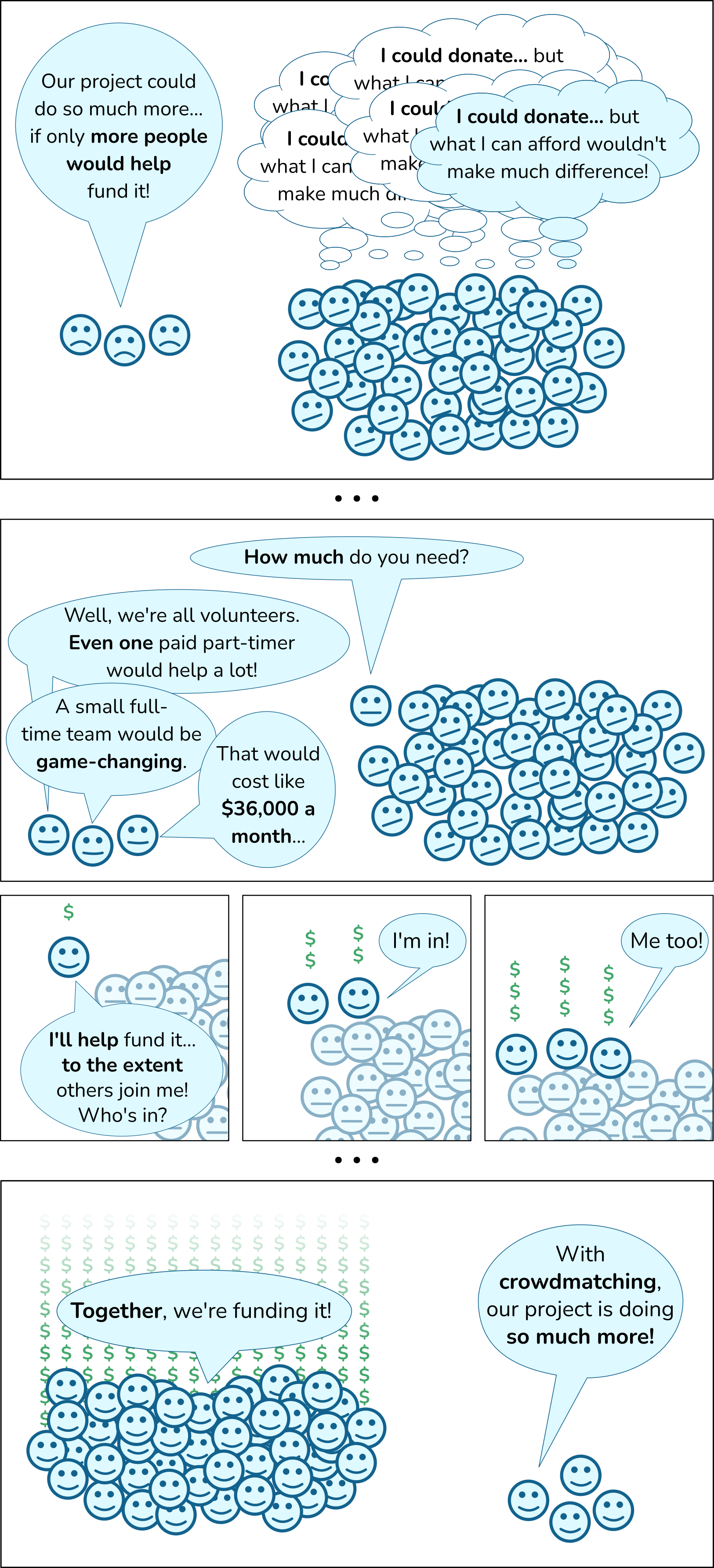 Crowdmatching empowers regular folks to effortlessly coordinate with others across the globe to provide game-changing funding for projects creating FLO works.